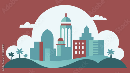 City skyline artwork showcasing tall buildings and a bustling city scene. City skyline with a variety of buildings and a lively urban vibe.