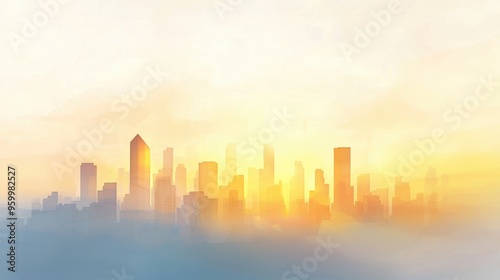 city, skyline, sunrise, gold, light, plaster bandage, shadow, peaceful, ambience, watercolor, soft, urban, atmosphere, relax, scenery, quiet, illustration, artwork, silhouette, serene, tranquil, hours, landscape, city landscape, morning