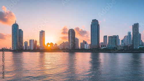 sunrise, skyline, tranquil, serene, water, sun, building, silhouette, city landscape, hope, calmness, calmness, serenity, peace, digital, modern, 21st century, highrise, urban, smoothness, light, beauty, calm, peaceful, dawn, morning glow, inspirational