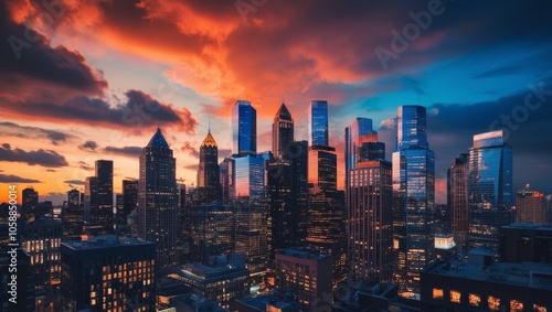 City skyline at sunset, showcasing tall skyscrapers under dramatic, vibrant orange and blue skies