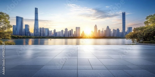 finance, speed, urban, transportation, cloud, empty, office, day, sunset, city, skyline, blue, sun, glow, building, tall, modern, tower block, skyscraper, water, lake, river, foreground, body, tree, greenery