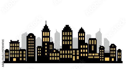 City Skyline with Silhouette Buildings and Yellow Windows