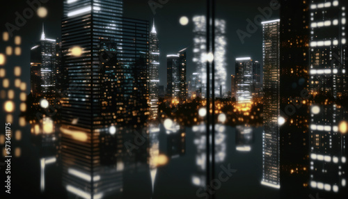 City skyscrapers at night, dark office building facade, lights reflection on glass. Generative AI