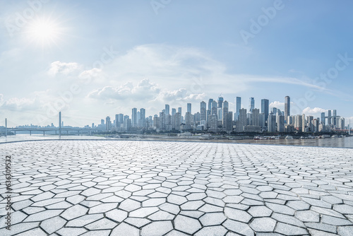 floor, street, skyline, sidewalk, road, square, architecture, asia, space, background, blue, brick, building, business, center, china, chongqing, city, cloud, commercial, destination, district, downtown, empty, exterior, famous, financial, ground, landmark, landscape, modern, nobody, office, panorama, pavement, sky, skyscraper, travel, urban, day, pattern, stone, footpath, tiled, city landscape, sunrise, river