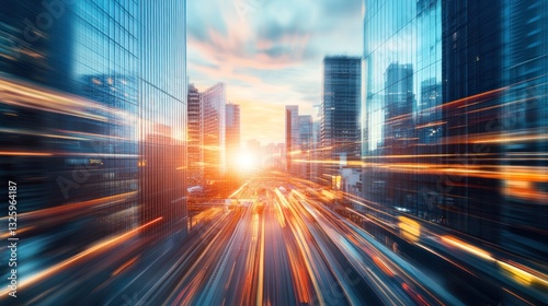 City street at sunset with motion blur effect, showcasing modern architecture and fast-paced urban life.