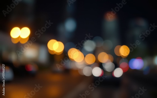 City street illuminated by lights at night creates a vibrant, blurred atmosphere of urban life