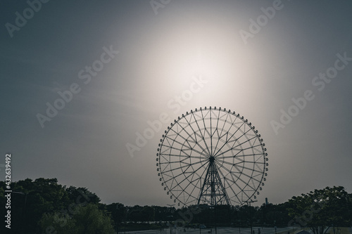 sunset, dusk, ferris wheel, forest, sky, sun, backlighting, city, shadow, blue, blue, orange, gold, gold, japan, tokyo, tokyo, landscape, lovely, light