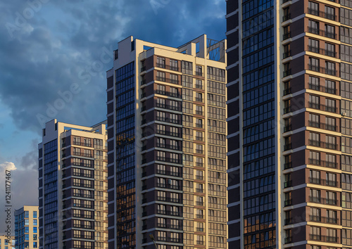 City view on a sunny day. Modern buildings, walls and windows.