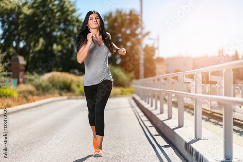 City workout. Beautiful woman running in an urban setting