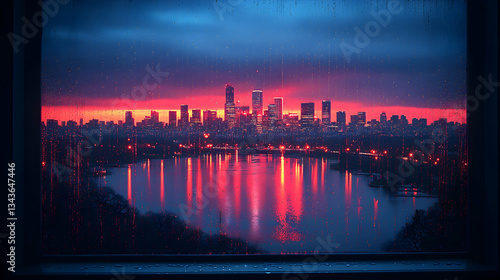 city, sunrise, dawn, city landscape, water, lake, building, skyline, morning, urban, panorama, view, window, rain, wet, glasses, red, pink, vibrant, colours, dramatic, atmosphere, light, glow, modern, metropolis, architecture, scenery, tranquil, peaceful, beautiful, amazing, stunning, photo, image, photo, artistic, high-coloured, colourful, landscape, city lights, winter, frost, cold