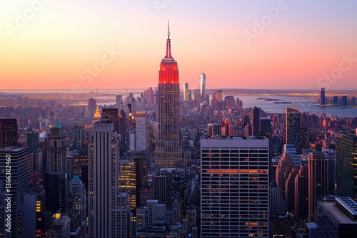 city, sunset, skyline, new york city, new york city, city landscape, urban, america, building, skyscraper, tour tourism, travel, view, photo, architecture, modern, iconic, empire state, golden hour, illuminated, panorama, horizon, daylight, evening, illumination, downtown, river, bay, harbor, aerial, top, facades, skyscraper, business, finance, tower block, gold, colours, photographic, destination, holiday maker, famous, beauty
