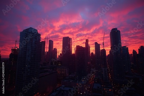 city landscape, sunset, skyscraper, city, building, urban, construction, crane, twilight, evening, night, red, pink, purple, cloud, sky, horizon, architecture, modern, glasses, concrete, steel, tower, light, illumination, shadow, silhouette, metropolis, downtown, vibrant, dramatic, atmosphere, view, aerial, perspective, highrise, development, scene, beauty, amazing, majestic, incredible