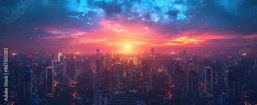 city, sunset, skyline, network, digital, line, node, futuristic, connected, aerial, view, urban, architecture, building, night, light, glow, horizon, cloud, sky, orange, pink, purple, blue, abstract, technology, datum, communication, connection, modern, global, earth, future, innovation, progress, concept