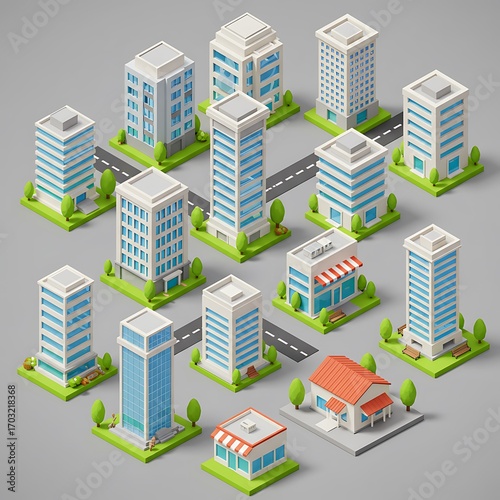 city, building, city landscape, isometric, model, architecture, urban, skyline, street, road, house, shop, store, commercial, residential, design, illustration, three-dimensional, rendering, tower, structure, collection, element, scene, miniature