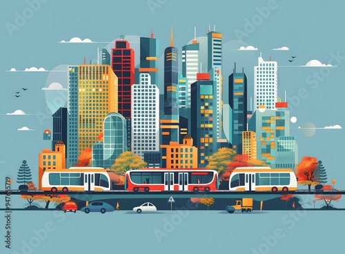 city, building, bus, illustration, urban, transportation, architecture, design, modern, skyline, street, vehicle, people, flat, vector, colourful, background, graphic, art, style
