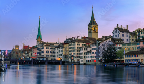 Cityscape of Zurich, Switzerland, at dus over the Limmat River in Altstadt