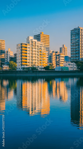 Cityscape Reflection in Calm Water at Sunset
