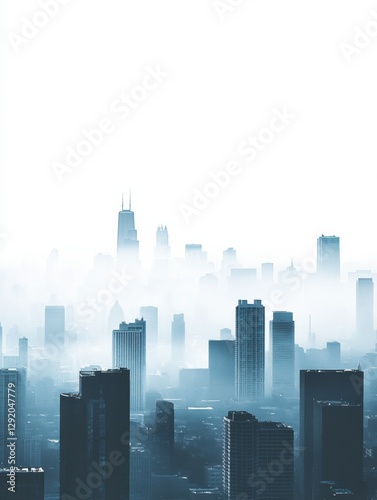 Cityscape shrouded in gray smog with building silhouettes fading into haze. Generative AI