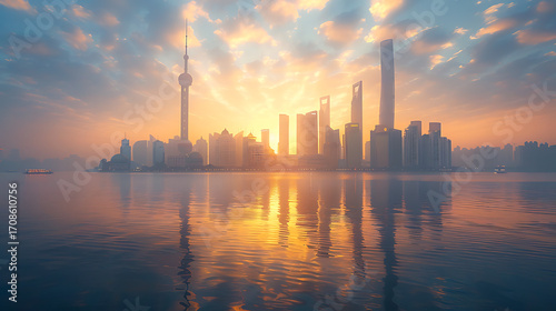shanghai, china, city landscape, skyline, urban, sunrise, skyscraper, asia, water, building, architecture, travel, modern, morning, business, landmark, tour tourism, river, city, east asia, asian, destination, scenic, view, light, dawn, gold, tranquil, beautiful, panoramic, tower block, finance, commercial
