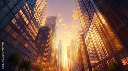 city landscape, urban, architecture, building, skyscraper, sunset, sky, cloud, window, glasses, light, gold, hours, perspective, modern, downtown, tall, metropolis, construction, exterior, facades, design, geometric, abstract, pattern, angle, sunlight, horizon, vista, view, upward, structure, high, rise, city, center, corporate, business, district, office, finance, energy, environment, future, artistic, drawing, illustration