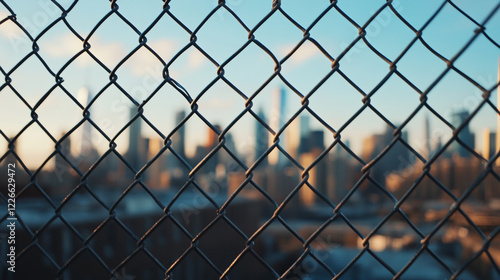 Cityscape View Through Chain Link Fence Urban Sunset sky grid wire metal steel photo image modern