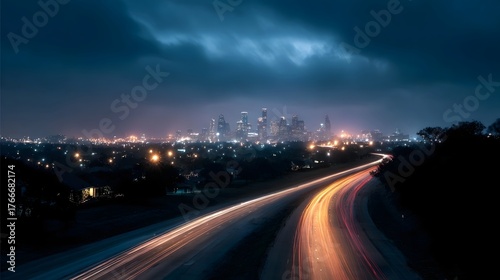 city landscape, highway, light, trail, dusk, cloud, city, skyline, night, sky, urban, landscape, background, foreground, horizon, tree, light, traffic, speed, motion, movement, transportation, driving, journey, commute, travel, road, interchange, rush, hours, blue, orange, yellow, white, black, bright, glowing, illumination, streak, trail, moody, dramatic, intense, energetic, vibrant, dynamic, atmospheric, huge