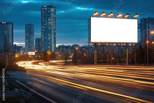 city, city landscape, dusk, highway, road, traffic, light, illuminated, street, urban, night, dark, sky, cloud, building, skyscraper, billboard, blank, advertising, signage, signs, advertisement, empty, space, modern, contemporary, structure, concrete, steel, glasses, window, street light, pole, asphalt, car, vehicle, transportation, motion, blur, speed, fast, background, design, business, commerce, concept, copy, message