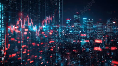 city landscape, night, financial, datum, stock, market, graph, chart, business, technology, trading, digital, finance, investment, economy, growth, trend, risk, future, progress, urban, skyscraper, building, light, illuminated, modern, futuristic, abstract, overlay, visualisation, blue, red, neon, dark, background