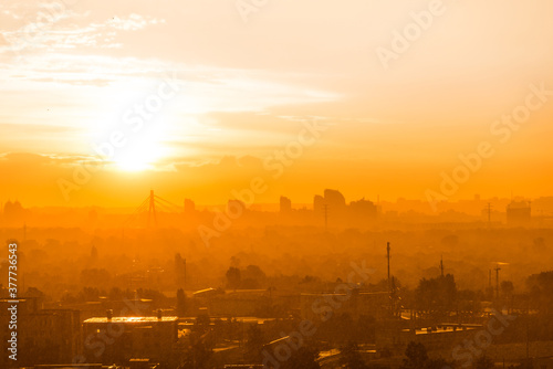Cityscape with sunset in big city, moderm bridge and buildings under dramatic sunset sky