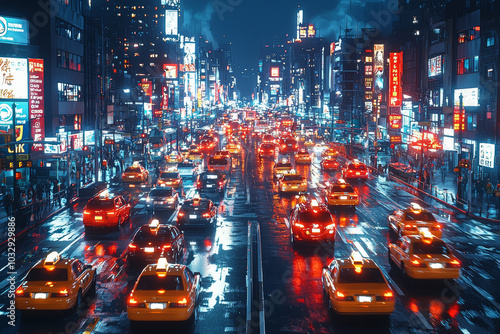 Cityscapes at night, with bright streetlights and passing cars, symbolize the fast-paced urban lifestyle. Concept of urban nightlife.