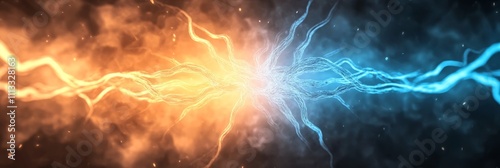 energy, electricity, digital artwork, abstract, fire, ice, blue, orange, light, shadow, texture, power, intensity, collision, clash, dynamic, mesmerizing, visual, artwork, illustration, fantasy, science fiction, magical, glowing, plasma