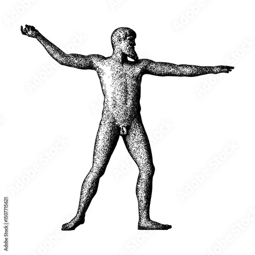 Classic Artemision Bronze statue illustration in vintage stipple engraving style isolated on transparent background