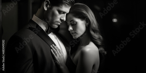 Classic black and white engagement portrait, timeless elegance, couple in formal attire, contrast lighting