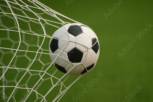 Classic black and white soccer ball caught in goal net on green field, symbolizing scoring and victory in football.
