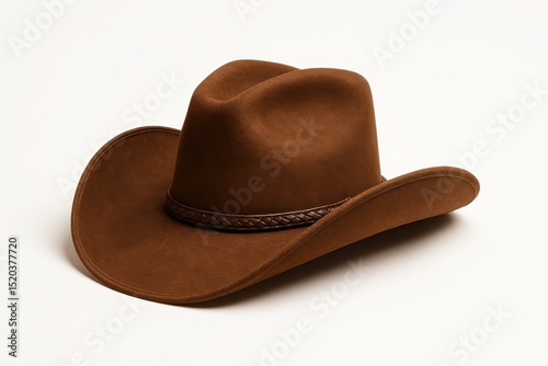 Classic brown leather cowboy hat with a wide brim and decorative band, isolated on a clean white background, symbolizing Western culture, adventure, and rugged individualism.