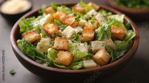 Classic Caesar salad with crisp romaine lettuce, croutons, shaved Parmesan, and creamy Caesar dressing, elegantly plated