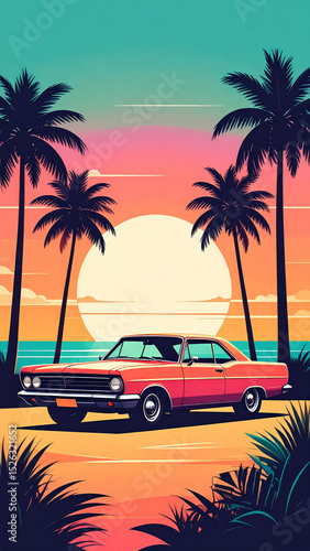 Classic car parked on the beach at sunset, surrounded by palm trees, in a retro style illustration
