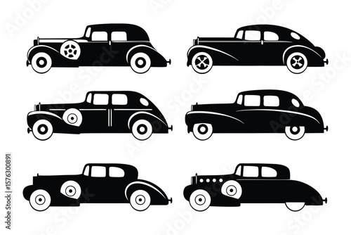 Classic Car Silhouettes: A collection of six vintage car silhouettes, showcasing classic car designs from the golden age of automobiles. Each silhouette is distinct.