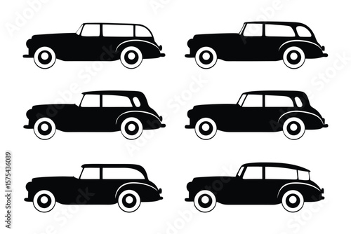 Classic Car Silhouettes: Collection of six vintage car silhouettes, showcasing different body styles from the mid-20th century. Perfect for projects needing a retro feel.