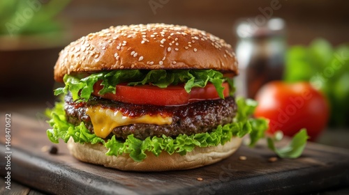 Classic cheeseburger presented on a rustic wooden board ready to be enjoyed