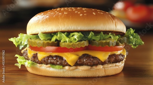 burger, cheeseburger, beef, patty, cheese, lettuce, tomatoes, pickle, bun, sandwich, food, delicious, juicy, tasty, meal, fast, american, classic, comfort, fresh, ingredient, epicure, eatery, serving, plate, wooden, table, closeup, appetising, deliciously, flavorful, savoury, fast food, deliciously, freshly, made, quality, honed, food photography, mouth-watering, ravenous