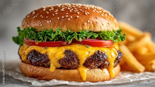 Classic Cheeseburger with Melted Cheddar Cheese, Fresh Vegetables, and Crispy French Fries
