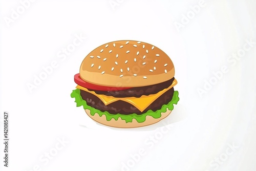 burger, cheeseburger, beef, patty, sesame, bun, lettuce, tomatoes, cheese, food, meal, snack, lunch, dinner, fast food, classic, juicy, fresh, sandwich, savoury, tasty, flavorful, cookery, dish, illustration, stylised, design, graphic, art, appetising, delicious, epicure, homemade, eat, kitchen, receipe, comfort, crave, hunger
