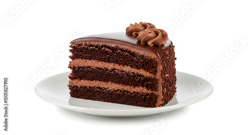 Classic chocolate cake slice with rich chocolate frosting and moist layers, served on a white ceramic plate, isolated on a pure white background, soft diffused studio lighting, high-resolution food p