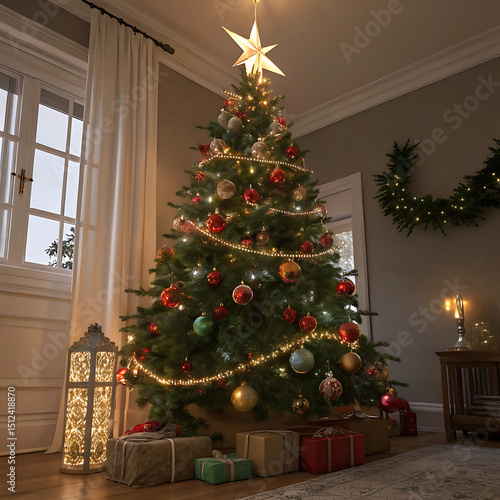 Classic Christmas tree decorated with baubles, garlands, and a shining star on top, indoor setting