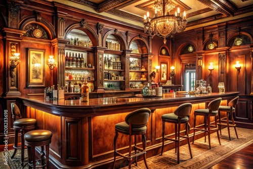 Classic cocktail bar with ornate wooden details and vintage posters, classic cocktail bar, wood paneling, old clockwork mechanisms