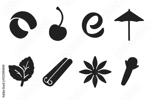 Classic Cocktail Icons. Solid, filled icon set of old fashioned garnishes: orange peel, maraschino cherry, lemon twist, cocktail umbrella, mint sprig, cinnamon