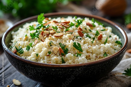 cauliflower, rice, almond, food, healthy, meal, receipe, bowl, garnish, herb, tasty, natural, vegetarian, rustic, fresh, delicious, organic, homemade, nourishment, favor, epicure, authentic, aromatic, wholesome, dinner, fried, dish, vegetable, meat, plate, chicken, cookery, pork meat, thai, risotto, salad, lunch, white, green, vegetable, red, eat