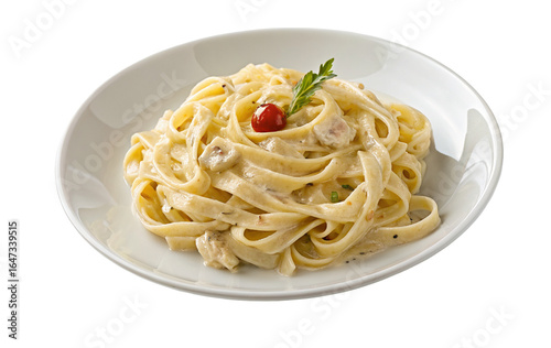 Classic creamy fettuccine alfredo with rich sauce and parmesan cheese in white plate serving