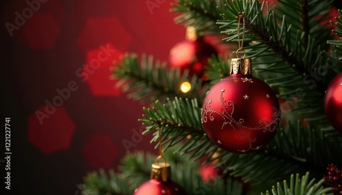 Classic decorated tree, red blurred lights, shiny ornament , lights, sparkle, backdrop